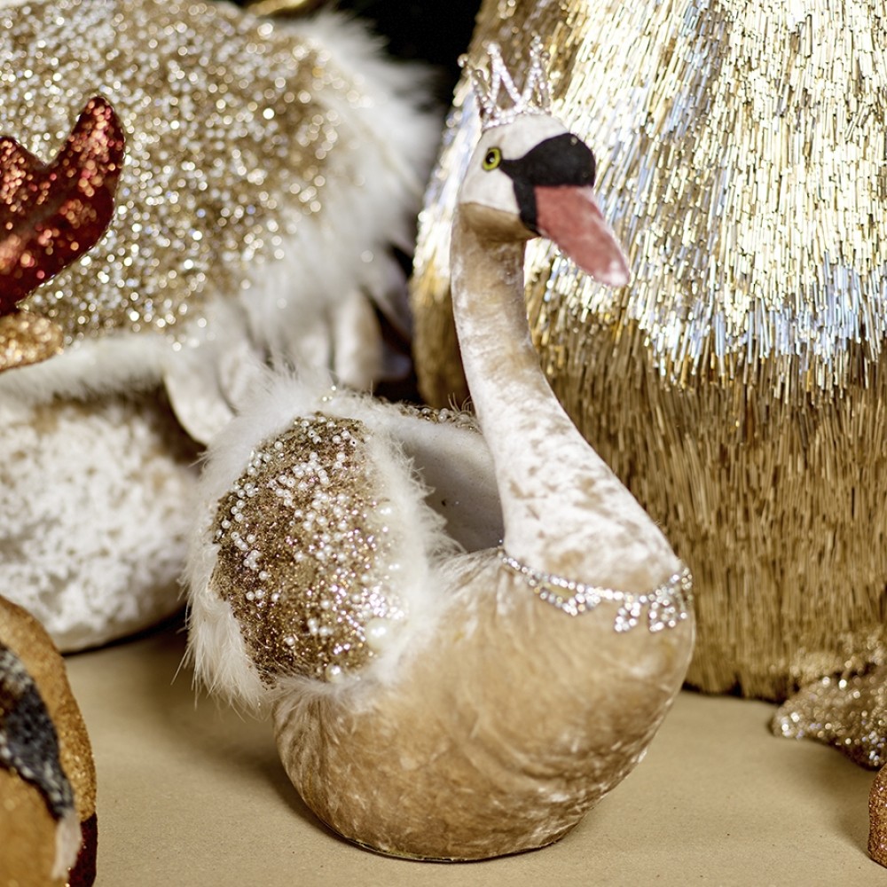 Svane, champagne velour med glitter og smykker, 34x20x37 cm